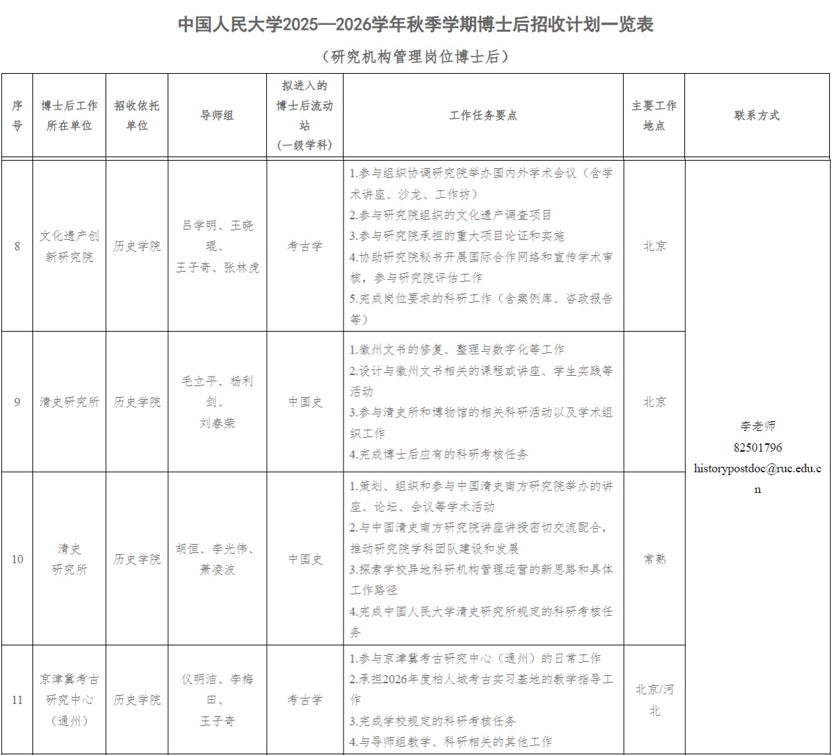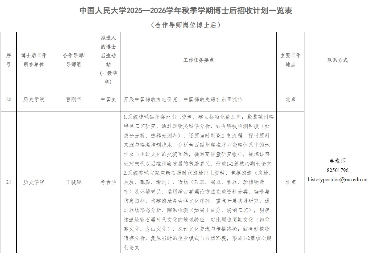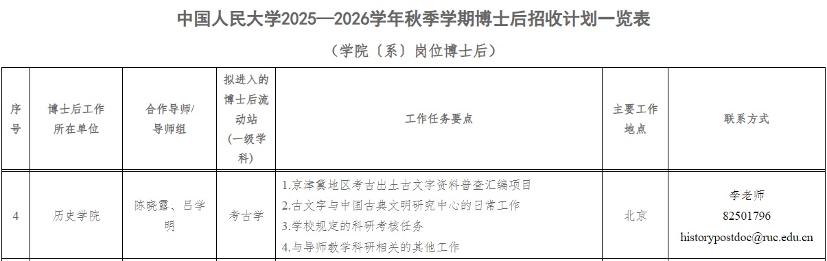 请有意申报者于2025年11月26日下午5:00前将申报材料(详见附件2)发送至学院联系人邮箱historypostdoc@ruc.edu.cn并抄送合作导师个人邮箱(见历史学院官网-师资队伍)。
