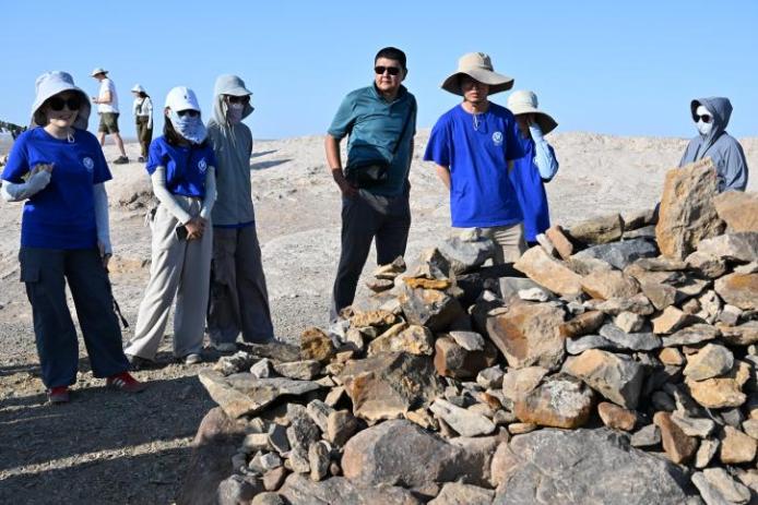该遗址位于努库斯以南约43公里处,位于阿姆河右岸,是琐罗亚斯德教徒用来进行天葬的场所,历史超过2200年。琐罗亚斯德教徒禁止腐烂的尸体玷污大地,因此死者被放置在天葬台上,供猛禽享用。当肉从骨头上剥离后,教徒们将骨骼遗骸收集到陶器容器中,即所谓的“纳骨瓮”中,然后埋葬。这种埋葬方式深深植根于琐罗亚斯德教哲学,反映了对自然元素的深切尊重。参观学习后,师生们一起合影留念。