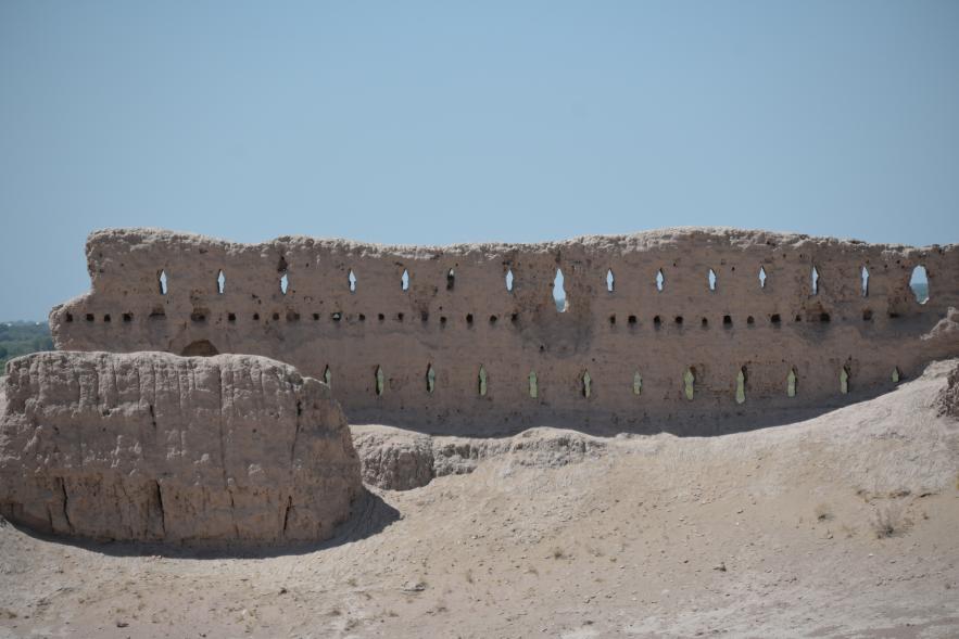 座谈会结束后,研学团师生来到由花剌子模研究院主持发掘的Kaladzhik Kala遗址参观学习。该遗址被认为是古代花剌子模地区最古老的堡垒之一。堡垒的墙高达14米,宽2.5米。从堡顶俯瞰,可欣赏到沙漠沙丘的壮丽景色。沙漠边缘与配有灌溉系统的农业田地相连。