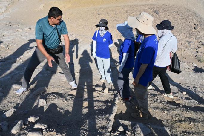 Abutalib Bekbauliyev研究员向研学团师生讲解遗址情况